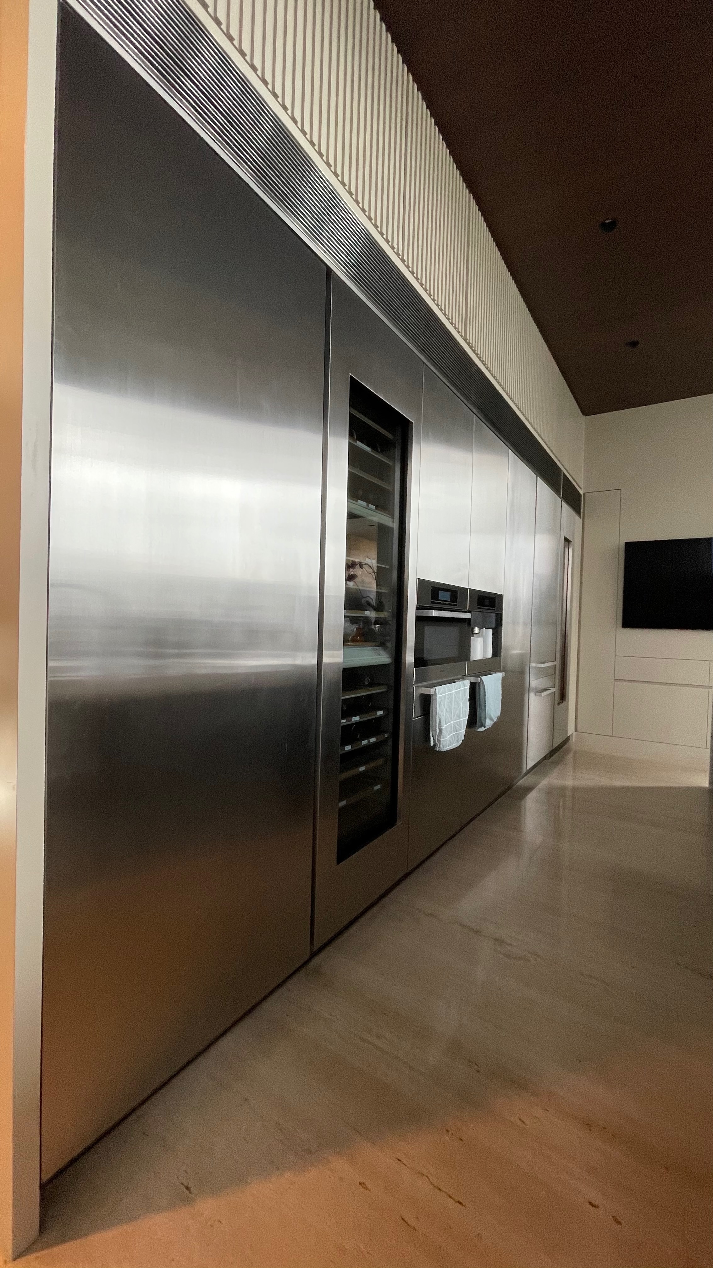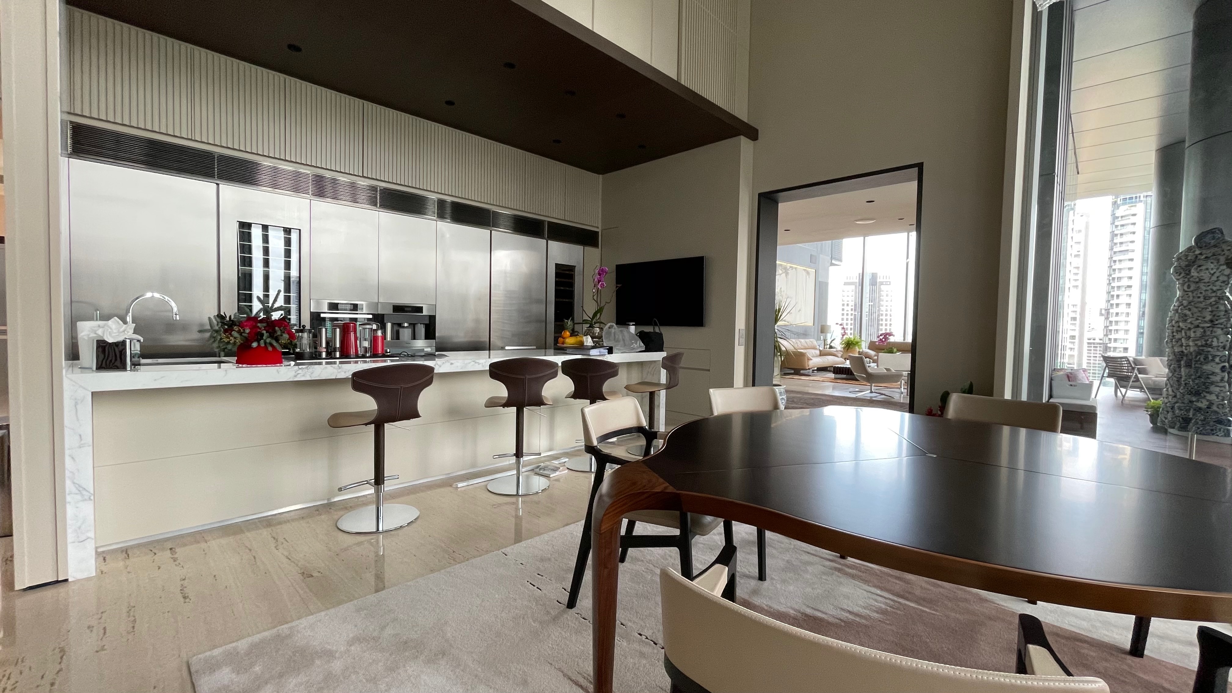 Anchored by a dramatic wall of brushed stainless steel and softened by vein-matched marble, The Marq’s dry kitchen is designed for performance as much as presentation.
